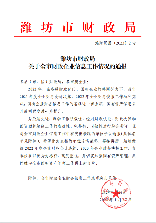近日,濰坊市財(cái)政局下發(fā)文件,對全市財(cái)政企業(yè)信息工作情況進(jìn)行通報(bào),我公司榜上有名,連續(xù)兩年被評(píng)為“全市財(cái)政企業(yè)財(cái)務(wù)信息工作表現(xiàn)突出單位”。公司歷來高度重視財(cái)務(wù)管理工作。2022年度一把手親自抓靠,通過會(huì)計(jì)工作數(shù)字化轉(zhuǎn)型、人才隊(duì)伍結(jié)構(gòu)優(yōu)化、會(huì)計(jì)職能